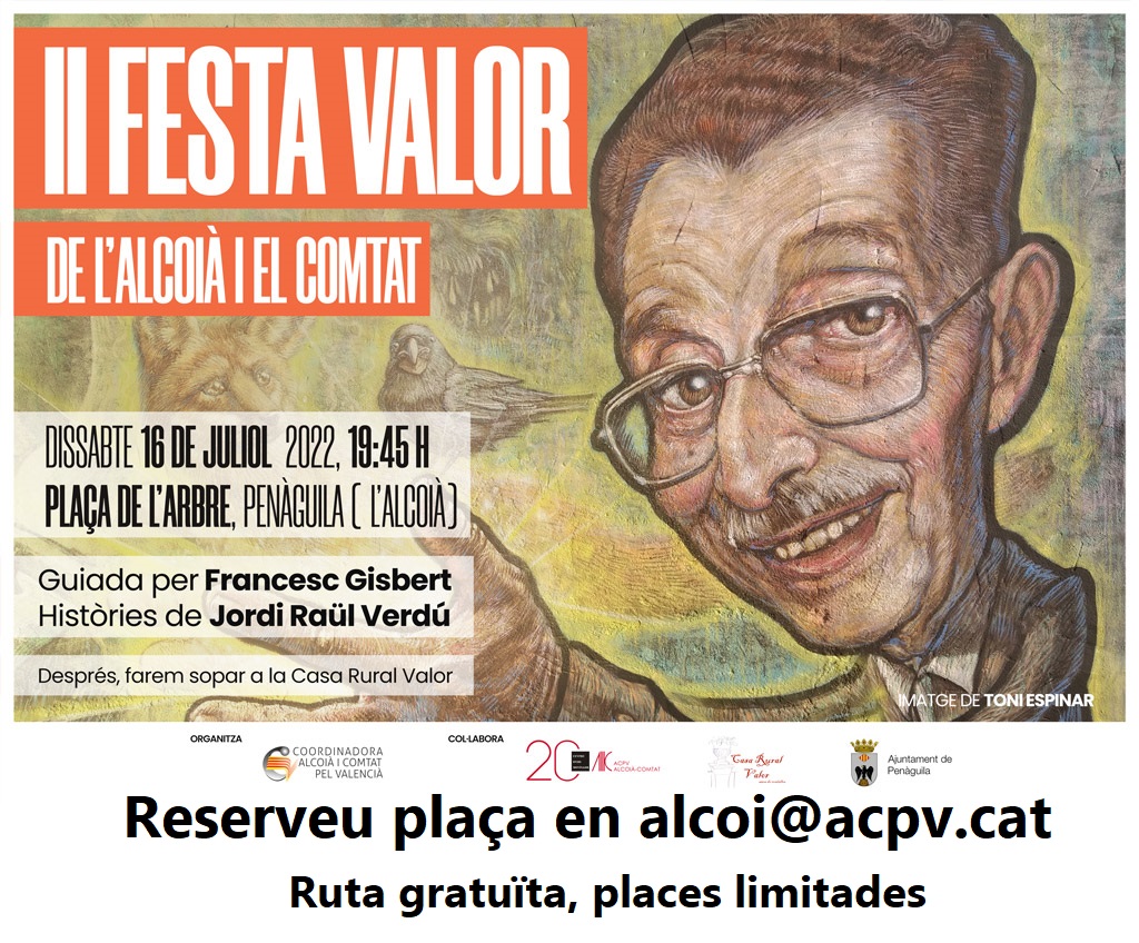 - 16 de juliol, a les 20h, Festa Valor. Ruta literària i nit de contes a Penàguila. Amb Jordi Raül Verdú i Francesc Gisbert. Activitat gratuïta, reserveu plaça en alcoi@acpv.cat