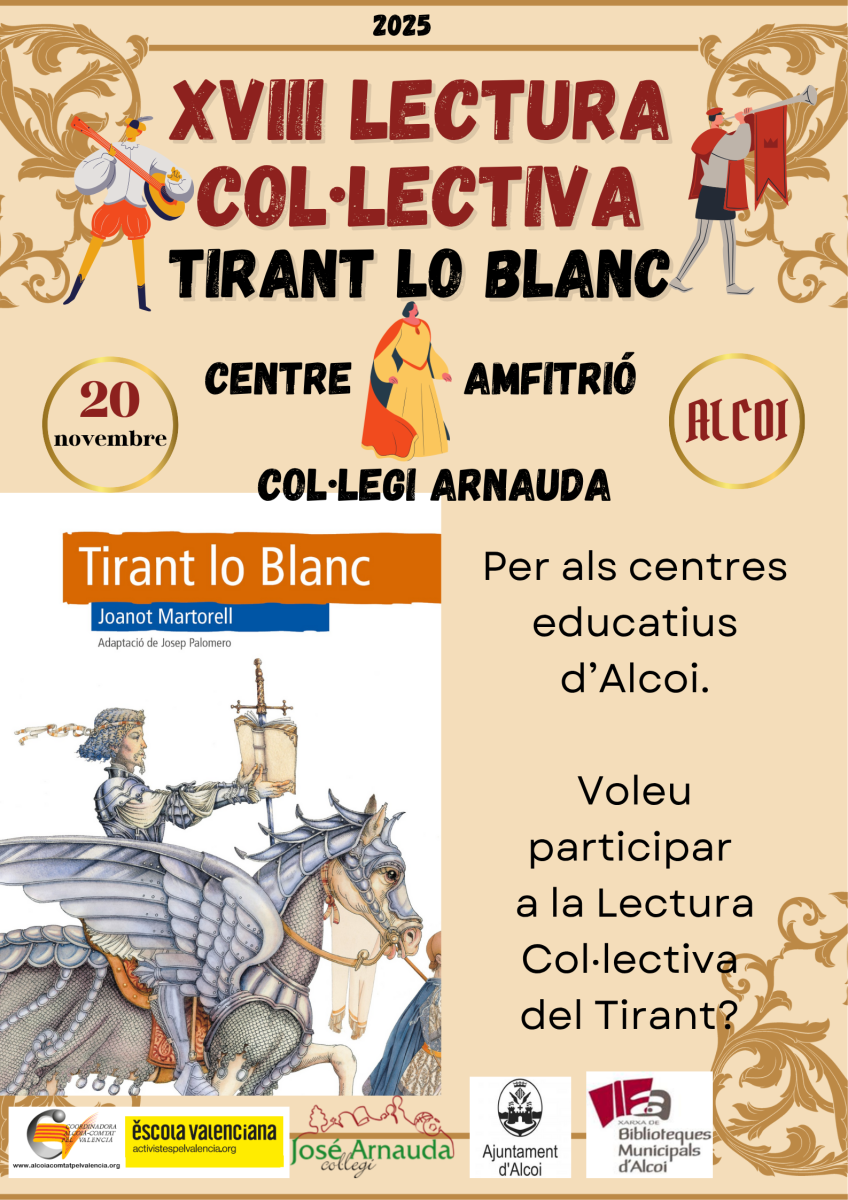 Des de la Coordinadora Alcoià-Comtat pel valencià i la Xarxa de Biblioteques Públiques d’Alcoi ens posem en contacte amb el vostre centre per convidar-vos a participar en la XXIII LECTURA COL·LECTIVA DEL TIRANT LO BLANC que farem el dijous 20 de novembre de 2025 al col·legi José Arnauda (el centre amfitrió enguany). Cada any, participen molts centres educatius d’Alcoi en una activitat que pretén retre homenatge a la nostra novel·la més universal i divulgar-la entre l’alumnat.